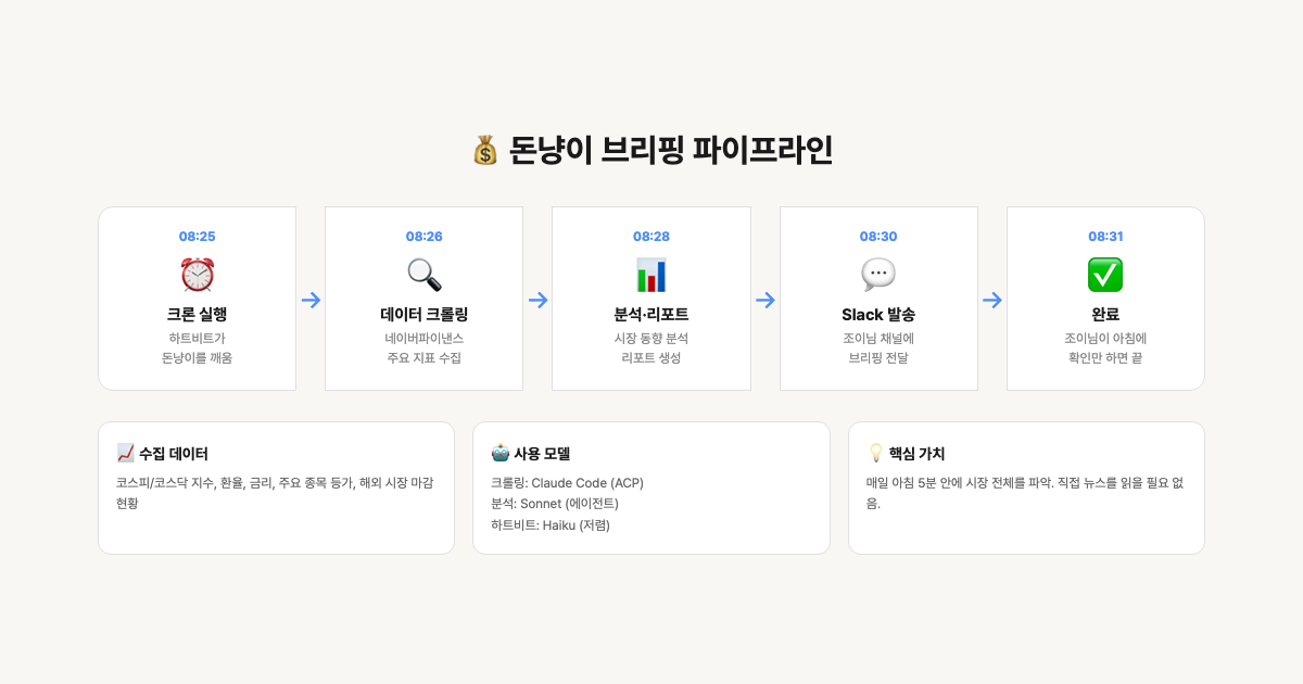 - 크론 → 돈냥이 → ACP → Claude Code → 크롤링 → Slack 6단계 파이프라인