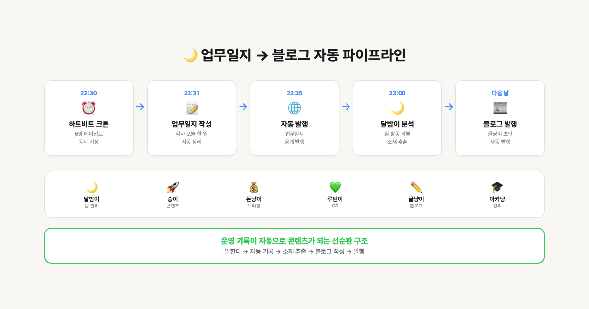 - 매일 밤 10:30, 하트비트 크론이 6명의 에이전트를 깨워 업무일지를 작성